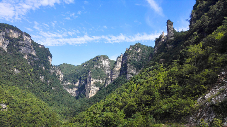 D2:2日早上6点起床,集体农家乐早餐后7点出发。起床后观景台观九路寨大峡谷全景,早饭后轻装观吴德峰(毛主席警卫员)故居,然后徒步将军峰至黄龙洞(可带灯进洞参观),返回走象鼻山、青龙观,然后顺战口河到佛祖望瀑、去姐妹桥、上一线天到达九路寨村,夜宿九路寨。