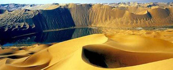 騰格里沙漠蒙语意为“天”,位于內蒙古自治区阿拉善左旗西南部,是中国第四大沙漠。大小湖盆400多个,半数有积水,沙漠西部地区淡水湖居多,盐碱湖相对少些,南部地区情况则相反,沙丘多为格状沙丘及沙丘链,新月及半月型沙丘多分布于边缘地区,高大复合型沙丘多分布于沙漠东北部,偶见于个别大型湖盆边缘,植物多为沙蒿,芦苇,骆驼刺及低矮灌木为主,野生动物多为小型哺乳及爬虫类。