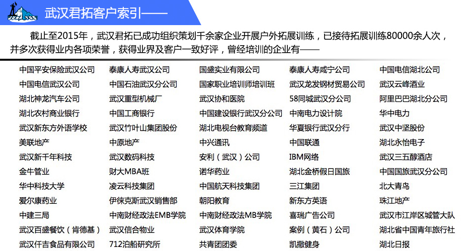 - [2019/04/09]【行业资讯-武汉君拓拓展】武汉公司团建户外拓展去哪合...