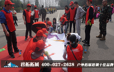 针对武汉神灯财富天紫湖大型户外拓展培训,武汉君拓户外拓展除了常规的一些户外拓展项目外还特意引进了“共绘蓝图”大型团队拓展项目,每一小组的队员(约6人一组)根据自己得到的任务书和材料,根据任务书上的要求各自完成自己的任务,一部分学员会根据某个特定的主题在木板的一面做剪贴画,充分发挥自己的想象力,一部分学员会将任务书上的要求,严格地按照要求来将图形按比例复原在木板上,最后在培训师的要求下将所有制作好的木板拼接到一起,则整体的效果会是在一面上都是各个队按照主题制作出来的剪贴画,多种多样,争奇斗艳,另外一面则是武汉神灯财富公司的企业文化的象征--logo。