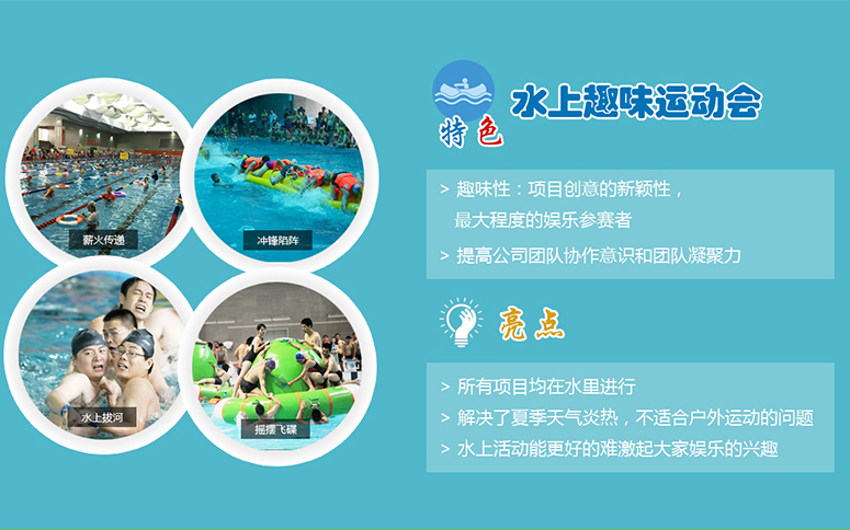 水上趣味运动会十种水上的趣味运动会项目 水上趣味运动会的项目很多,这里随意介绍一些: 1、男女自由泳之类的 2、皮划艇竞速 3、龙舟竞渡 4、缅甸桥 5、扎阀泅