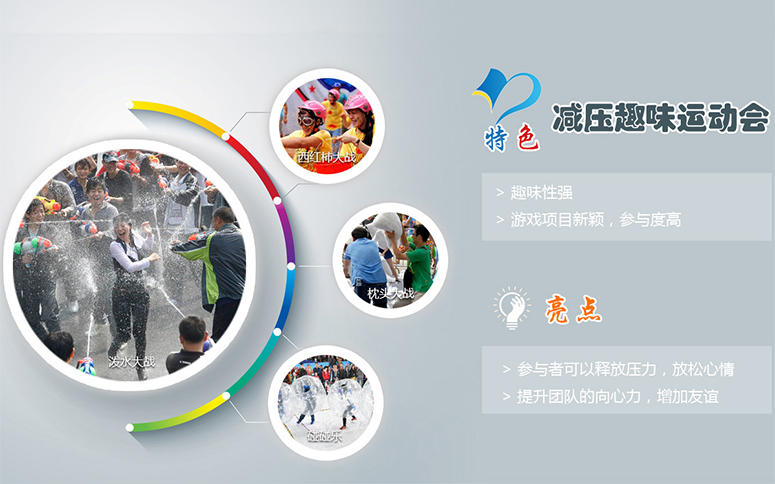 减压式趣味运动会随着都市生活节奏很快,让每个人都喘不过气来,需要面对感情、家庭、工作等等,每个人都背负巨大的压力,因为无法释放压力,就会严重影响平时的工作和生活,甚至有人因为无法面对这些压力而自寻短见,造成了不计其数的悲剧。有压力就要释放,减压趣味运动会就是其中一种非常适合团队人员放松的方式,通过减压趣味运动会让大家释放压力,放松心情,使身心更加健康。