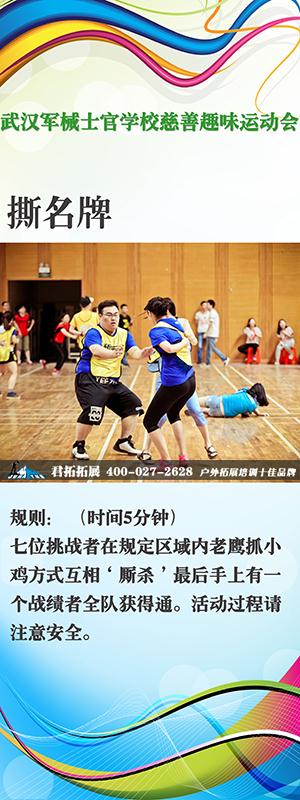 说明:此次活动是在武汉军械士官学校内进行的,所以活动全程禁止拍照、摄影!武汉君拓拓展只能通过介绍活动项目规则的X展架与大家分享这有爱的慈善趣味运动会。